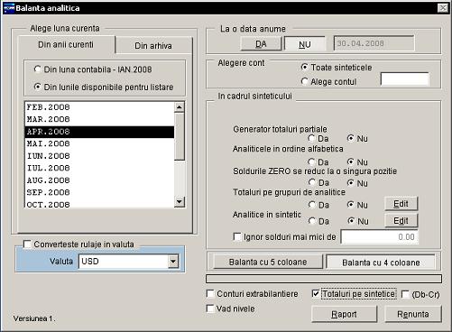 - Solduri zero se reduc la o singura pozitie: implicit este "Nu", iar prin apasarea butonului "Da" conturile analitice cu sold zero sunt cumulate pe un singur rind.