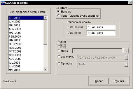 Raportul genereaza lisa cu avansurile acordate personalului intr-o luna. Dupa selectarea lunii pe care se genereaza raportul se mai pot configura urmatoarele optiuni: