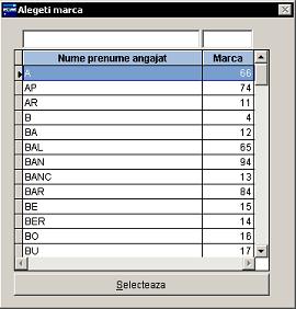 Marca - se poate introduce un numar de marca al salariatului care se va include in raport, fie prin introducerea numarului pe campul disponibil, fie prin apasarea butonului , de unde din fereastra care se deschide (Alegeti marca) se poate face cautarea (dupa nume sau dupa marca din campurile de deasupra denumirii coloanei) si selectarea marcii (Selecteaza);